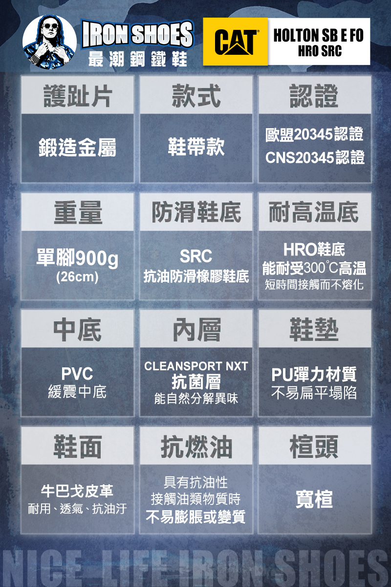 SRC防滑+HRO耐熱耐燃油橡膠大底(耐熱約300°C),適合高溫工作環境。